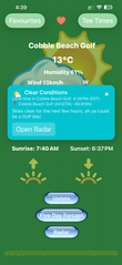 When a new location is selected a current status banner will pop up with golfing advice. Swipe up to dismiss